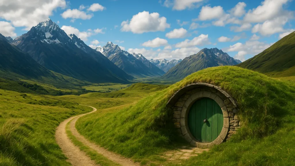 O set de Hobbiton é um exemplo de cenário que virou atração permanente. As casinhas, o verde aparado e o pub The Green Dragon funcionam como experiência turística.